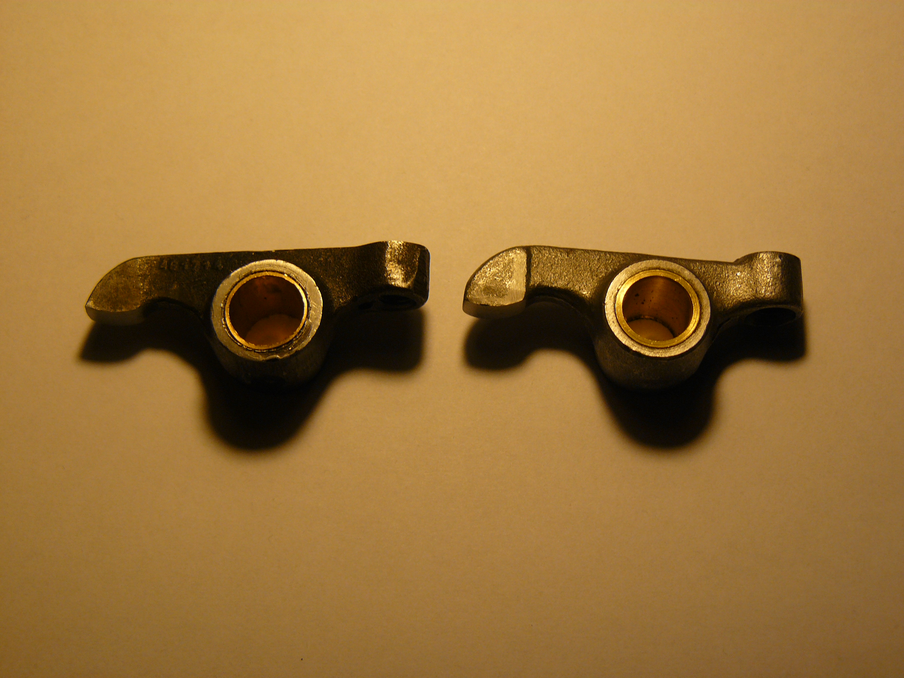 Das Thema Kipphebellagerung und -verschleiß ist noch nicht vom Tisch. Zur Debatte stehen Repro Kipphebel und das Ausbuchsen mit Bronze. Testweise einen Repro Kipphebel bestellt. Die gute Nachricht: das Material ist härter als bei den Originalen. Wenn die Geometrie der Druckfläche zum Ventilschaft stimmt, könnte das ein echter Vorteil sein. Diese Fläche ist bei den Originalen oft eingehämmert, was das Spiel-Einstellen enorm erschwert. Der Durchmesser Bohrung beträgt ca. 14,06 mm zusammen mit der untermaßigen Welle von 13,98 mm: Geklapper und nicht besser als verschlissenen alte Kipphebel. Macht aber nichts, weil eh Bronzebuchsen rein sollen. Ich hatte das Glück außerhalb der Vertriebswege an ein 16er Vollmaterial für Kipphebelbuchsen zu gelangen das definitiv geeignet ist. Von der Stange gibt es nach langer (seeeehr langer) Sucherei leider nur http://de.misumi-ec.com/eu/ItemDetail/10300031870.html aus "Spezialbronze" (innen 12 mm außen18 mm, Breite 20mm). Ich habe ein Datenblatt bekommen, teilw. chinesisch, dessen Daten so interpretiert werden können, dass ich es auf einen Versuch ankommen lasse, um der Gemeinde zu berichten um vielleicht Nachahmer anzustiften. Dank meines Werkstattbuddies, seinen goldenen Händchen und der Drehbank entstanden zwei Probebuchsen mit den Maßen innen 13 außen 16 aus beiden Materialen. Ein alter Kipphebel und ein Repro Kipphebel wurden auf 16 aufgebohrt/gerieben. Die Buchsen mit Füge-Welle-Nabe von Loctite eingepresst und eine Buchse schon auf Wellenmaß aufgerieben, siehe Bild. Links schon aufgerieben rechts noch mit 13er Maß. Den alten Ventiltrieb habe ich schon ausgebaut (was haben sich die Citroen Ings eigentlich dabei gedacht, die Schraube vorne rechts im Kühlwasse enden zu lassen?! Ich vergesse es immer wieder und wunder mich warum plötzlich Kühlwasser raussprudelt! - Grad erst das Öl gewechselt!). Die Kipphebelwelle zeigt nach 15.000 km die bekannte starken Einlaufspuren, noch dazu ist sie entsprechend der Lastrichtungen verbogen. Der Test erfolgt erstmal an dieser Welle mit den beiden konditionierten Kipphebeln. Die Laufflächen werden mit 600er an diesen Stellen etwas geebnet. Das Ziel-Spiel von 0,03 mm lässt sich zwar hier nicht mehr unbedingt einhalten, aber ist ja ist ja auch nur ein Test, der mir einen neue Welle nicht wert ist. Eine neue Welle würde ich nitrieren lassen, weil sie dadurch auch etwas steifer wird und sich vielleicht nicht mehr verformt. Allerdings könnte man bei den dafür erfoderliche 100 EUR auch gleich eine Anfertigung aus geeignetem Material erwägen. Ich gehe davon aus, dass alle Händler die gleiche Kipphebelwelle im Regal haben und dort weiter Anfragen bzgl. der Qualität nicht weiterbringen. Wenn der Einbau erfolgt ist berichte ich von den Erfahrungen.