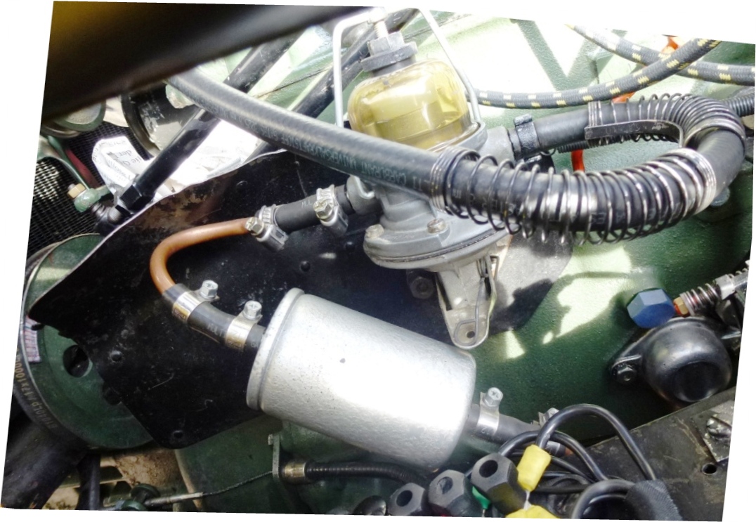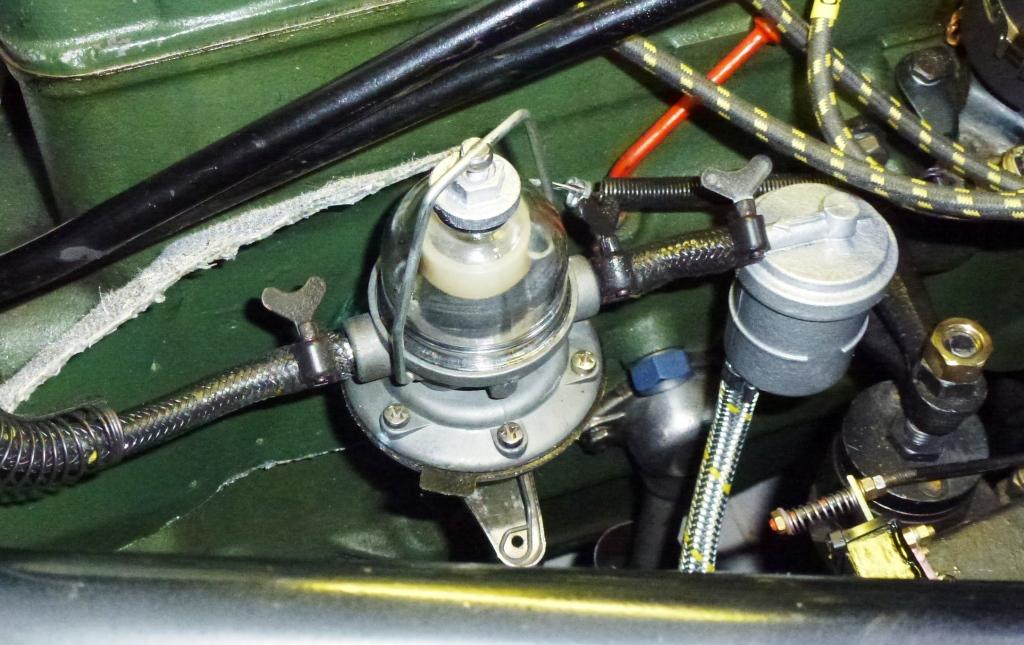die Benzinpumpe hat in Fahrtrichtung vorn ihren Eingang, dann Motorseitig einen Benzinfilter (unter einer Glaskuppel mit einem Schraubbügel gehalten) und daneben den senkrechten Ausgang nach oben. Meinen nicht mehr guten Glasbehälter habe ich durch ein Alu-Drehteil ersetzt. Der darin befindliche Filter, ein kaputtes Drahtsieb, wurde entfernt und durch ein großvolumiges Durchgangsfiter vor der Benzinpumpe ersetzt. Mit dieser Konfiguration fahre ich seit  30 Jahren und habe noch nie Probleme gehabt, auch keine Dampfblasen im Benzin bei knuffigen Temperaturen in Italien.