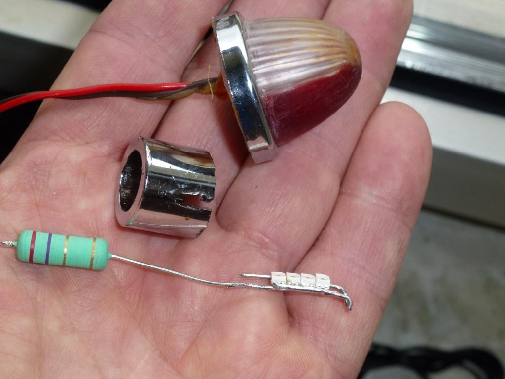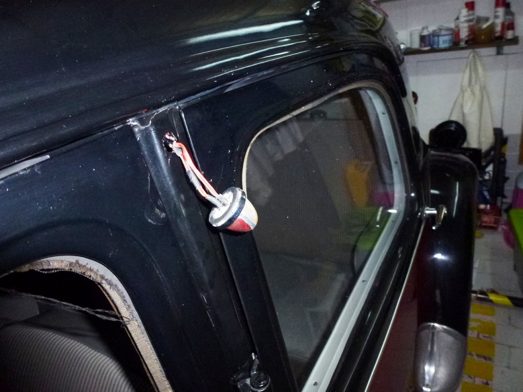Von der Leuchte den gesamten Lampenfuß abgesägt. Anstatt der großen Glühlampe winzige Leuchtdioden (wamweiß, rot) in den übrig gebliebenen Leuchtkörper eingesetzt. Die komplette Leuchte auf die B-Säule aufgeklebt.