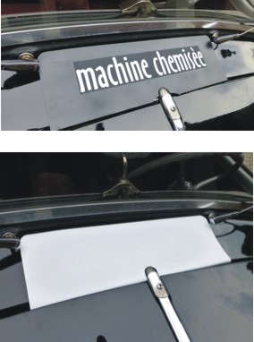 Diese Konstruktion mußte wieder raus, um den Scheibenwischermechanismus einbauen zu können. Dann wollte ich das Auto nur noch fertigbekommen und nun geht der Wischer, aber die Klappe nicht und ist - natürlich - auch undicht. Bis ich mal die Muße habe, den ganzen Kram wieder auszubauen, verwende ich meinen "Klappenabdichter". Es ist eine Magnetfolie, formgeschnitten und gebogen, damit sie auch bei der Fahrt sicher sitzt.