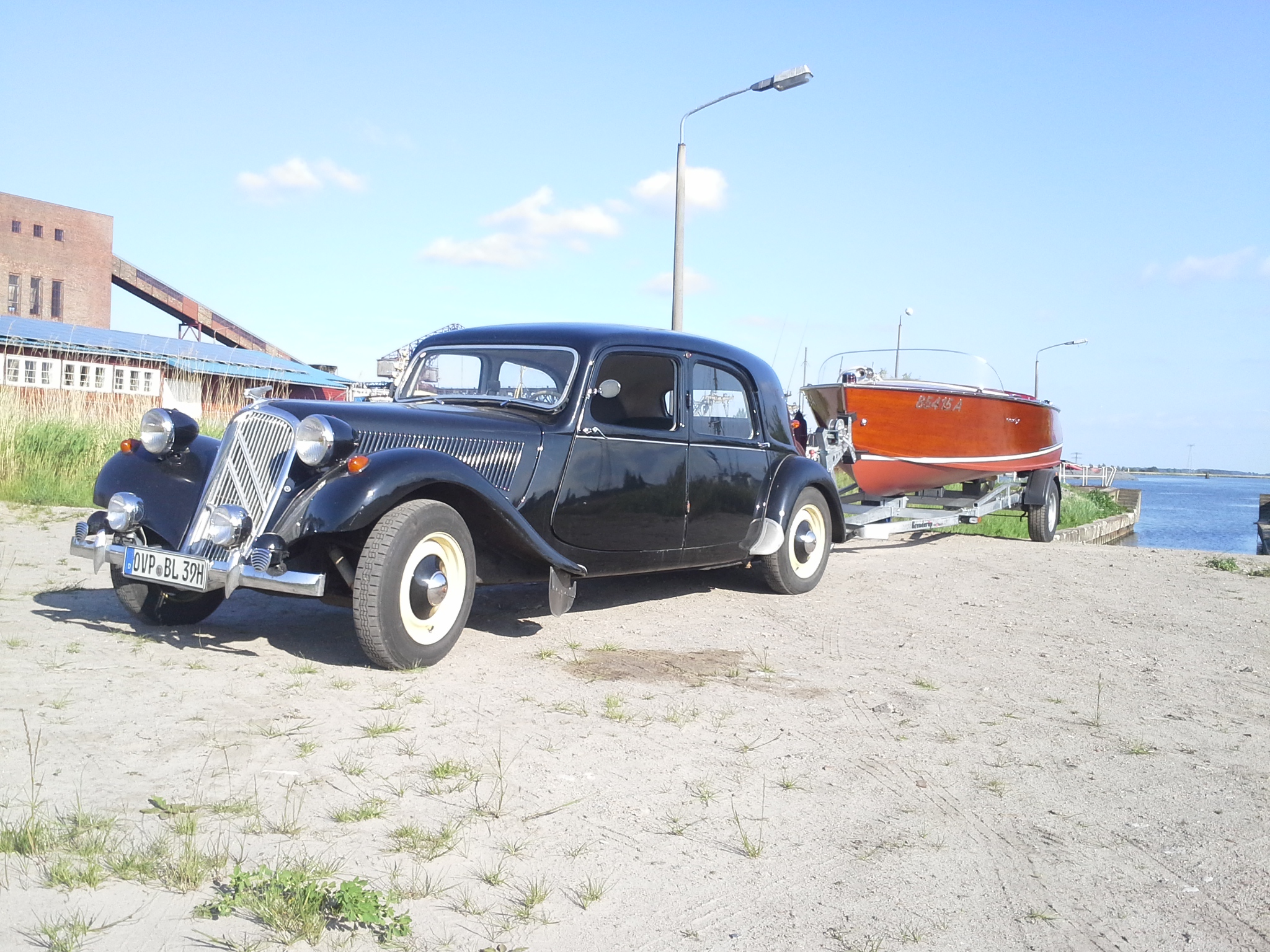 Der Anhänger auf dem Foto war nur eine kurze Strecke bei uns im Hafen angehängt, der ist ein bischen schwer für den Wagen. Passt aber gut, eine 1952er Cris Craft hinter einem 1954er 11CV.