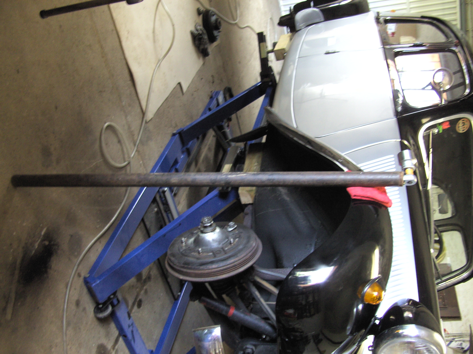 Auf Grund der Konstruktion der Traction mit selbsttragender Karrosserie sowie der Notwendigkeit, dass zum Ausbau von Motor und Getriebe die Vorderachse belastet sein muss (> Hinweis im Buch "Traction Avant für Anfänger und Fortgeschrittene"), empfehle ich einen kräftigen (= breiten) Rollwagenheber sowie eine Wagenheberbrücke. Um sicher zu gehen, sollte für Arbeiten, bei denen Kraft angewendet wird, das Fahrzeug auf Böcke gestellt werden, wie sie für wenig Geld im Baumarkt zu bekommen sind. Sowohl die Wagenheberbrücke, als auch verschiedene Böcke sind auf dem Internet zu finden. Ich persönlich schwöre auf meine Arbeitsgrube mit eingebautem Wagenheber mit selbstgefertigter Wagenheberbrücke (gab's damals noch nicht zu kaufen...), aber natürlich hat nicht jedermann die Möglichkeit, seine Garage so einzurichten. Daniel Eberli