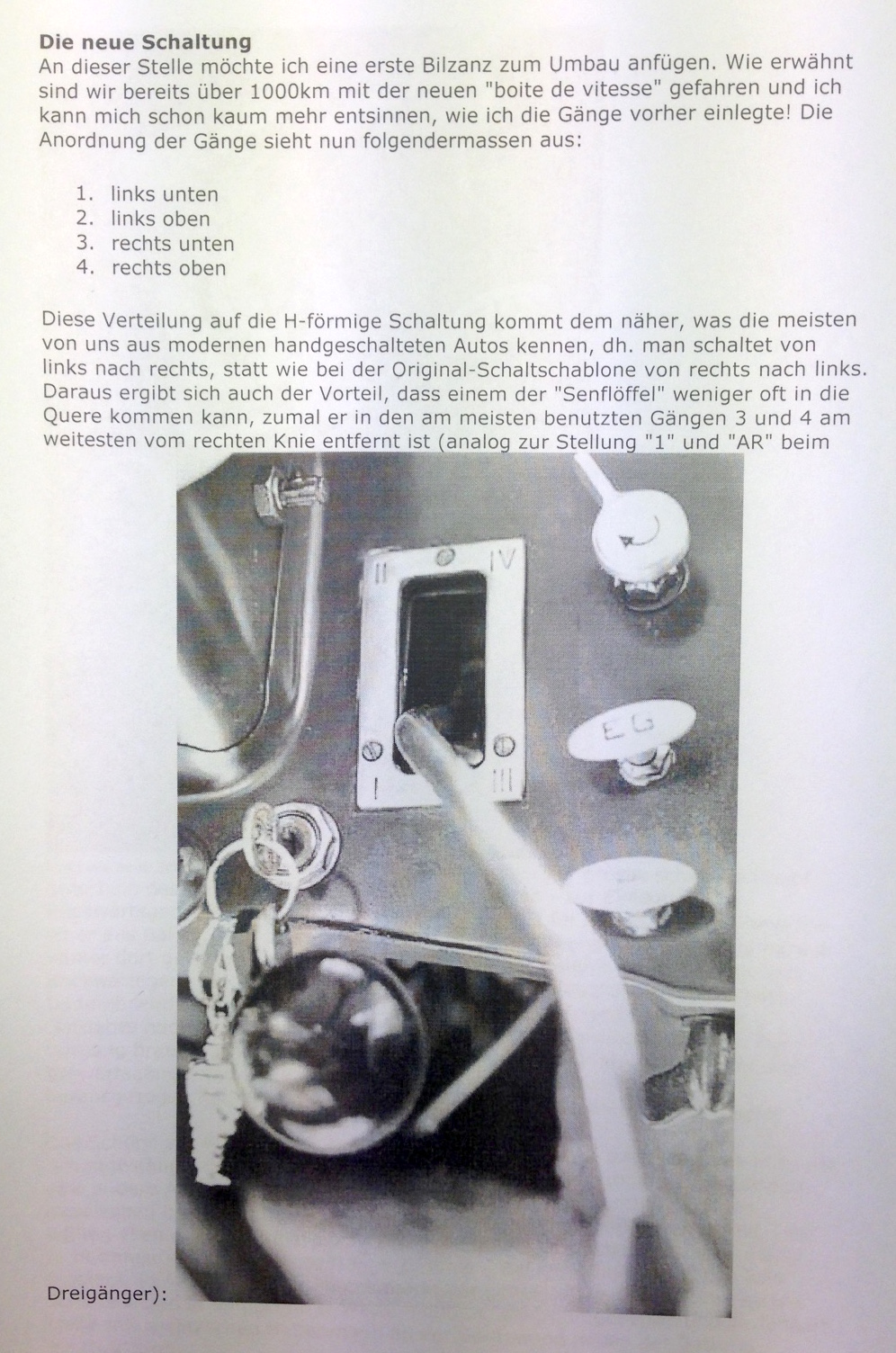 Grüß Dich Jörg, leider kann ich nicht damit dienen. Ich habe das Auto mit dem schon eingebauten Getriebe übernommen. Der Vorbesitzer - auch Mitglied hier - hat mir ausführliche Unterlagen über das Auto mitgegeben. Dabei ist der Hinweis auf den 4-Gang-Umbau nach "Chauvet". Auch ein Bericht von "Caspar & Jaqueline" liegt mir vor. Den habe ich mal selbst im Internet gefunden, jetzt aber leider nicht mehr. Aber: Das Netz vergißt nichts. Ich lege die Ausdrucke als JPEG bei. Ich vermute, daß die beiden in der Schweiz leben und für www.tractionavant.ch geschrieben haben. Und weil es vielleicht andere auch interessiert, antworte ich Dir über das Forum. Ja und vor 20 Jahren hat mein Vorbesitzer folgenden Reparaturauftrag an die Firma Auto-Motor-Sport, Berlin, Herrn Kornetzky vergeben: - Ausbau und Reparatur des Getriebes (3. Gang arretiert nicht mehr), vermutliche Ursache: Abbldung 173, Synchronring 500809 hat abgeschliffene Mitnehmerzähne; Abbildung 173, Verriegelungsfeder 501183 gebrochen. Bei den Abbildungen bezieht er sich wohl auf das Reparaturhandbuch. Viele Grüße aus dem Süden, Sepp