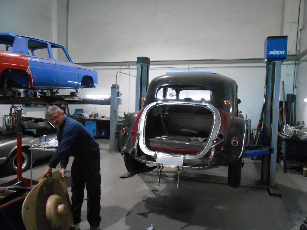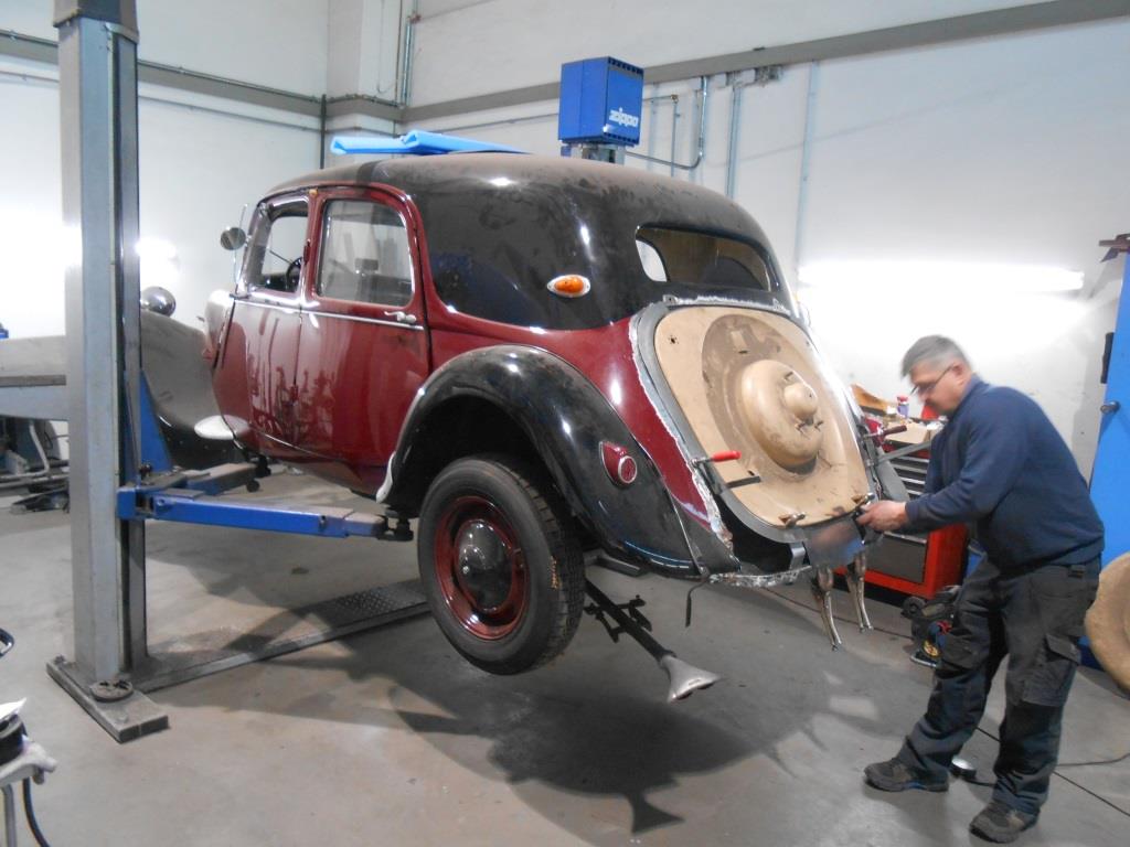 Da ich in der Schweiz bei der Lager-Auflösung eines Sammlers sehr günstig an Karosserieteile nebst allen notwendigen verchromten Beschlagteilen und farbrikneue (nie gebrauchte) verchromte "geschweifte" Stroßstangen nebst Halterungen eines Nachkriegs-Radmodells gekommen bin, wird die Zeit, in der der Motor restauriert wird dazu genutzt, meine 53er Traction (Koffermodell) zum Radmodell umzubauen.