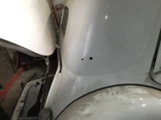 Gelöst: gefunden: französisches Chassis, glaube ich. Siehe Fotos. Man hatte innen Klebeband draufgemacht auf die Löcher, und diese dann überspachtelt. Als ich da drauf kam, das das hinter der Verkleidung Spachtel ist, wars per Schraubenzieher easy. Carsten