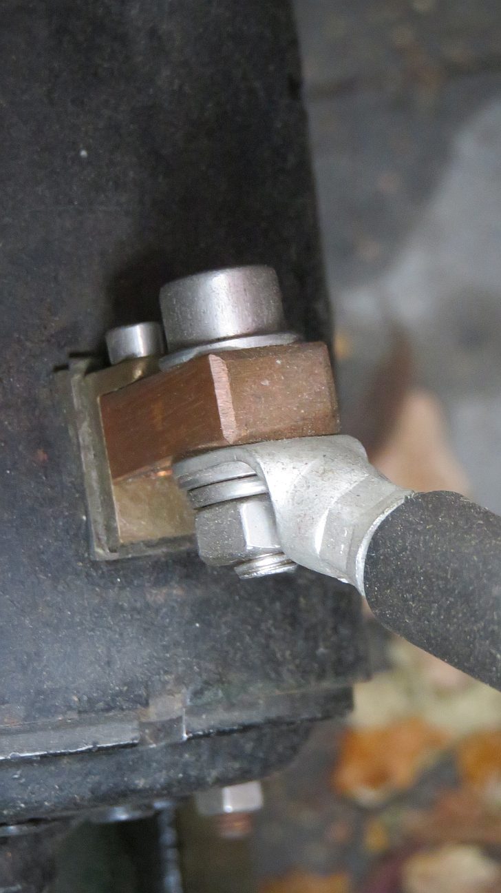 Ein kleines Kupferklötzchen an den Messingwinkel geschraubt, der aus dem Anlasser rausschaut, um das dicke Kabel zum Startrelais sauber kontaktieren zu können.