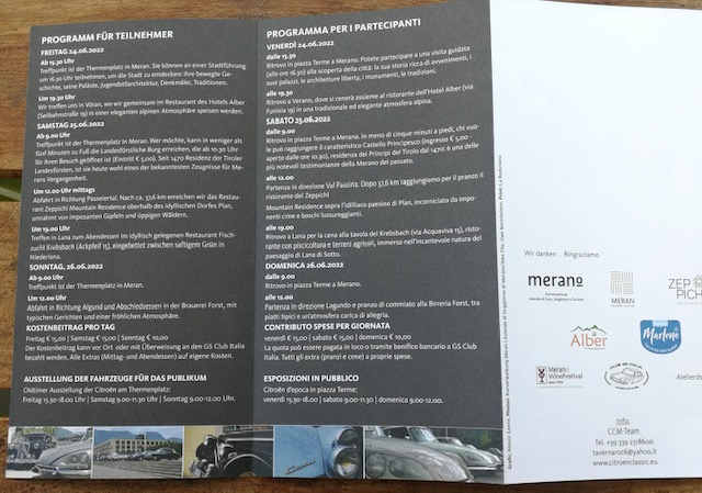 vom 24. bis 26. Juni findet nun bereits zum 16. mal in und um Meran das traditionelle Citroen Classic Meran/o Treffen statt. Klassische Citroen, schöne Landschaft, gutes Essen...