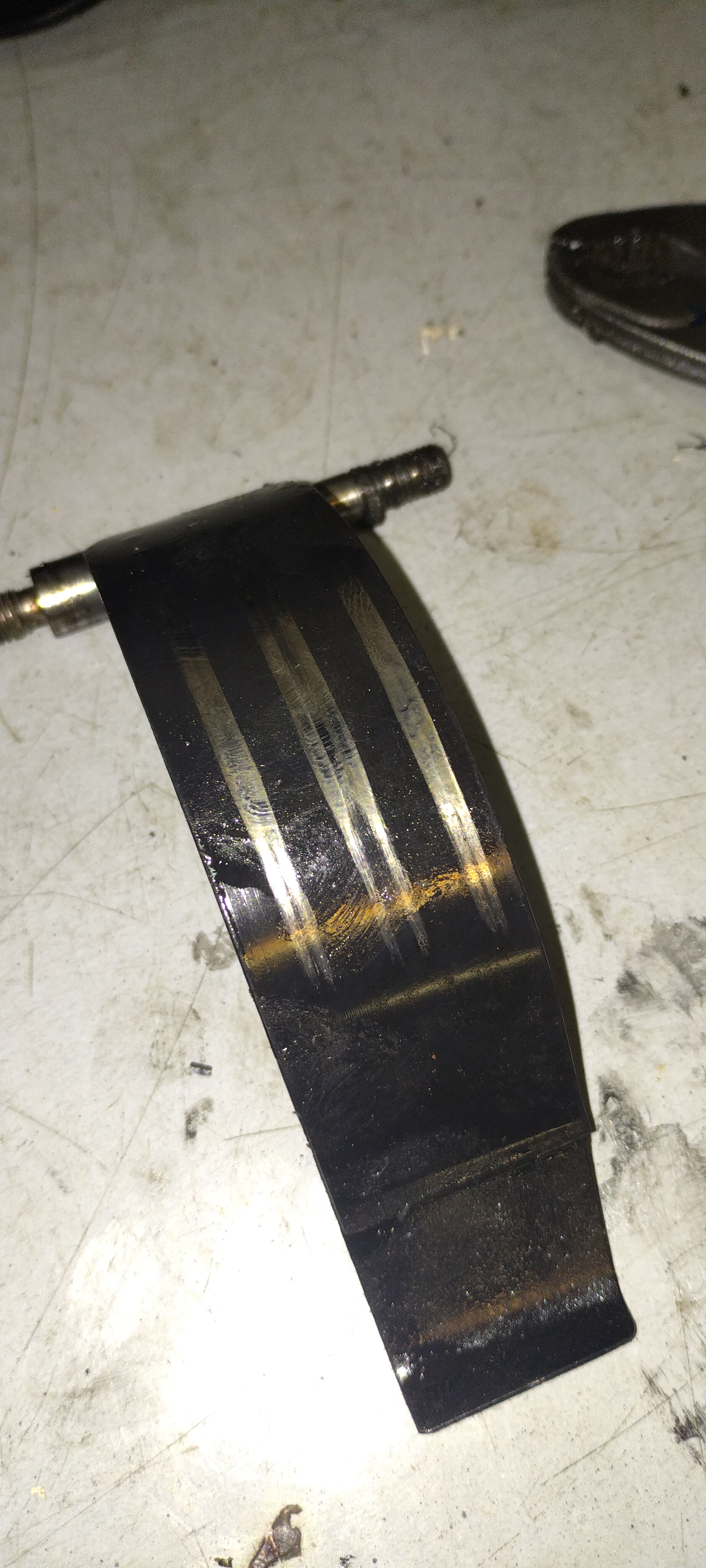 Bremsbeläge genietet oder geklebt? Ggf. mit Reißnadel an den ausgeqollenen Kleberkanten die Festigkeit überprüfen.