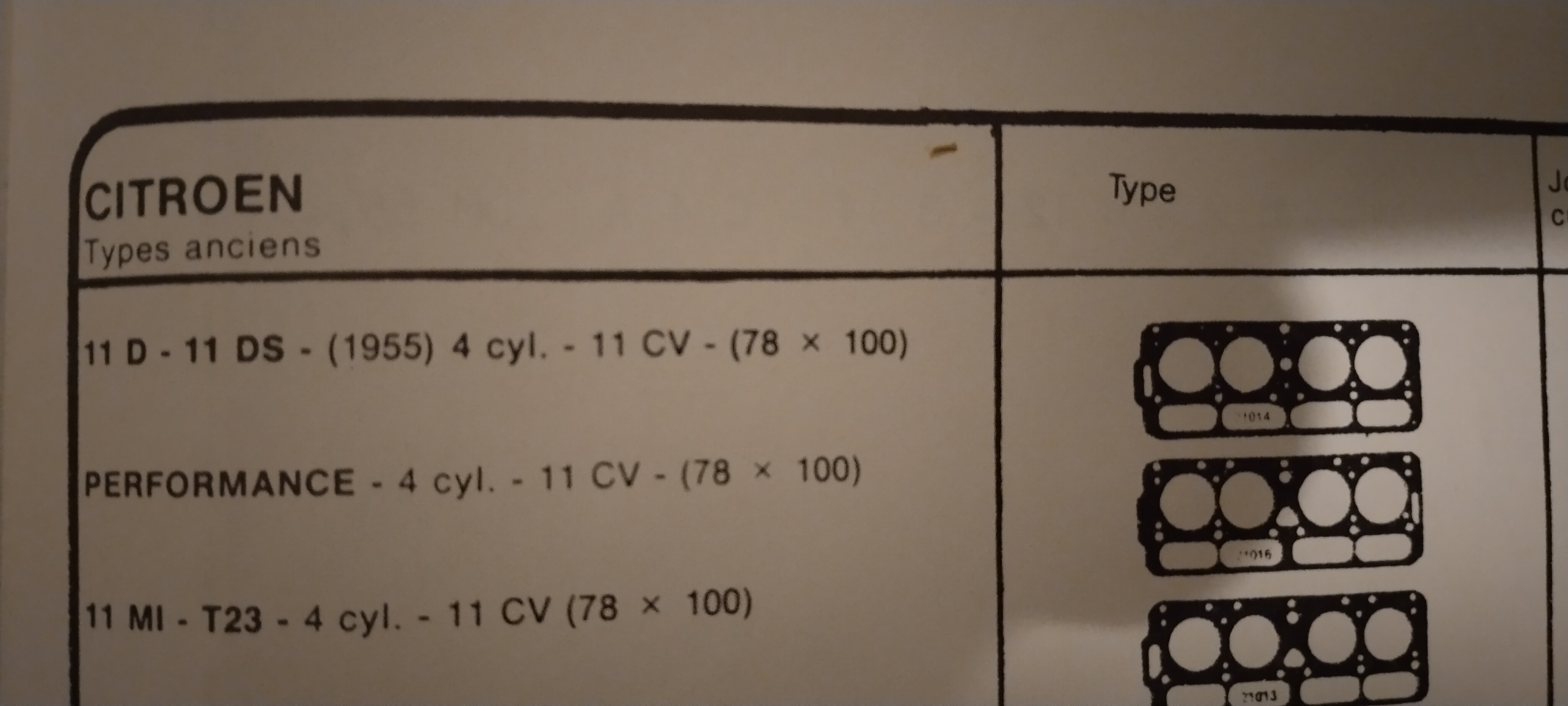 Gemäss "Catalogue des Pièces Détachées" für Traction Avant 7 und 11, Modelle 1934 bis 1957, hat die Zylinderkopfdichtung des 11D die Nummer 453105, bei früheren Motoren werden zwei Nummern angegeben: 451626 und 453105. Es dürfte somit Sinn machen, vor der Montage die Dichtungen und besonders deren Öffnungen für die Wasserkanäle zu vergleichen...