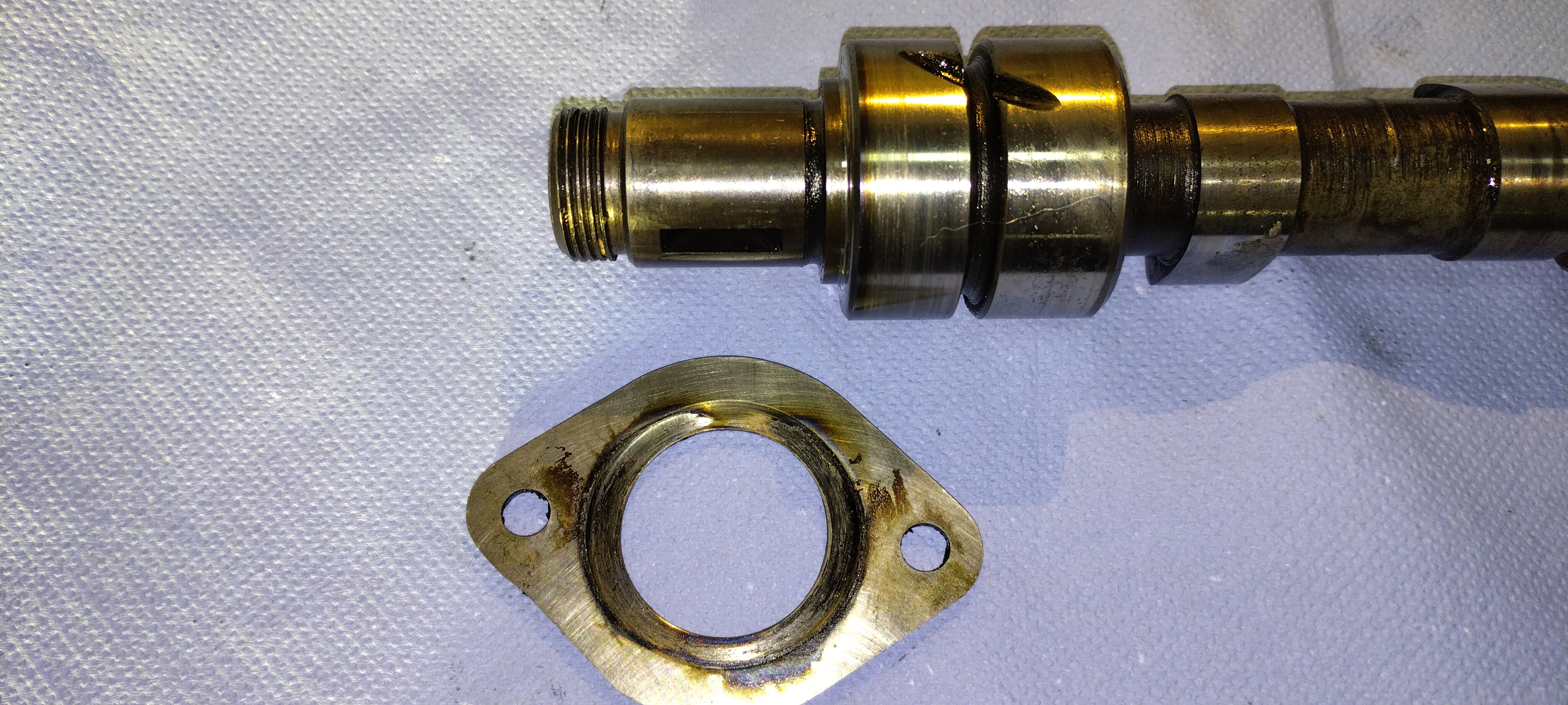 Beim Zerlegen meines alten Motors (Perfo) ist mir aufgefallen, dass die Schheibe 461143, die die Nockenwelle unter dem Stirnrad fixiert stark eingelaufen und leicht gewölbt ist. Anlaufspuren an der Scheibe und der Nockenwelle zeugen von hohen Temperaturen. Zunächst fiel mein Verdacht auf das Zwischenstück zwischen Motor und Getriebe zum Antrieb der Riemenscheibe. Wenn dieses zu lang ist, kann es die Nockenwelle nach hinten drücken. Alllerdings misst dass Zwischenstück 21,5 mm und ist somit das kürzeste verfügbare. Es gibt auch längere Versionen und eine Prüfung an der alten Kupplungsglocke mit der alten Antriebswelle der Riemenscheibe ergab keine Auffälligkeiten. Das Zwischenstück sollte 4 mm Luft haben und es weist auch keine Spuren an den Stirnflächen auf.