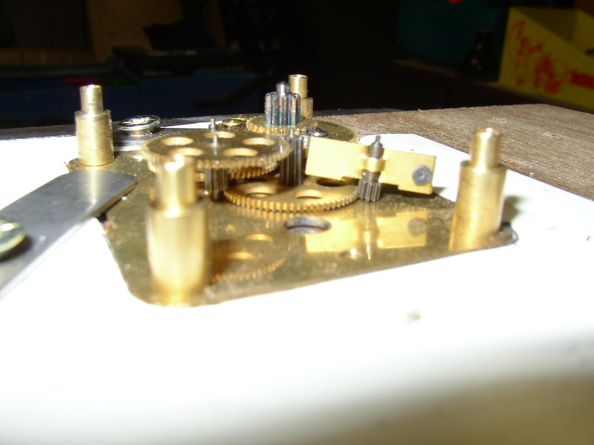 Falls Werner eine mechanische Minuterie hat, so kann ich sagen, daß eine Justierschraube für die Geschwindigkeit nicht vorhanden ist. Der Zeitablauf wird durch eine Feder gesteuert, die einen Uhrwerksmechanismus in Gang setzt. Verschiedene Rädchenübersetzungen sorgen für eine Ablaufverögerung. Die wesentliche Rolle spielt eine kleine Flügelachse in diesem Getriebe. Größe und Gewicht dieser Flügelein bestimmen die Ablaufgeschwindigkeit. (siehe Foto) Man könnte sicher durch Lötzinn-Aufbringung versuchen, dies Ding träger zu machen und damit die Geschwindigkeit zu verändern. Die Zerlegung ist ganz einfach, der Zusammenbau aber nicht ohne. Die starke Rückholfeder will wieder in Position gebracht werden und das geht eigentlich nur mit Geduld, Hilfshalteeinrichtung und vier Händen......