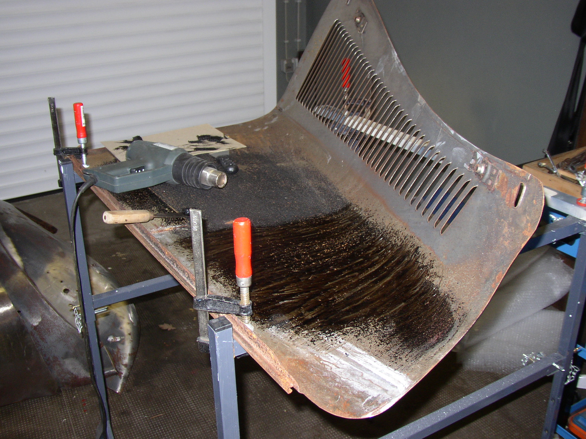 Ich habe bei der Restaurierung das Bitumen abgekratzt und ein modernes Antidröhn genau so aufgespritzt, wie ich die alte Bitumenschicht vorgefunden hatte. Anschließend die Haube innen uns außen wieder in Wagenfarbe überlackiert.