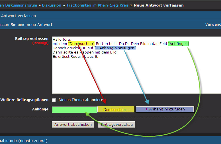 Hallo Jörg, mit dem "Durchsuchen"-Button holst Du Dir Dein Bild in das Feld "Anhänge" Danach drückst Du auf "+ Anhang hinzufügen". Dann sollte es klappen mit dem Bild. Es grüsst Roger H. aus S.