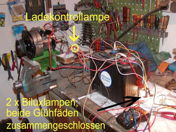 Zur Zeit mache ich mit einer 12 Volt-Drehstromlichtmaschine einen Testlauf mit einem 7 Voltregler. Die LiM liefert ca. 7,07 Volt. Wenn ich die Biluxlampen ( zusammengeschlossen 170 Watt) an die Batterie hänge, diese fällt auf ca. 5,9 Volt runter durch die Belastung, ohne das die LiM läuft, leuchten diese normal, ist die LiM. im Betrieb, erhöht sich die Leuchtkraft der Lampen etwas und die LiM. bringt ca. 6,85 Volt, deshalb merkt man auch das Erhellen der Lampen.