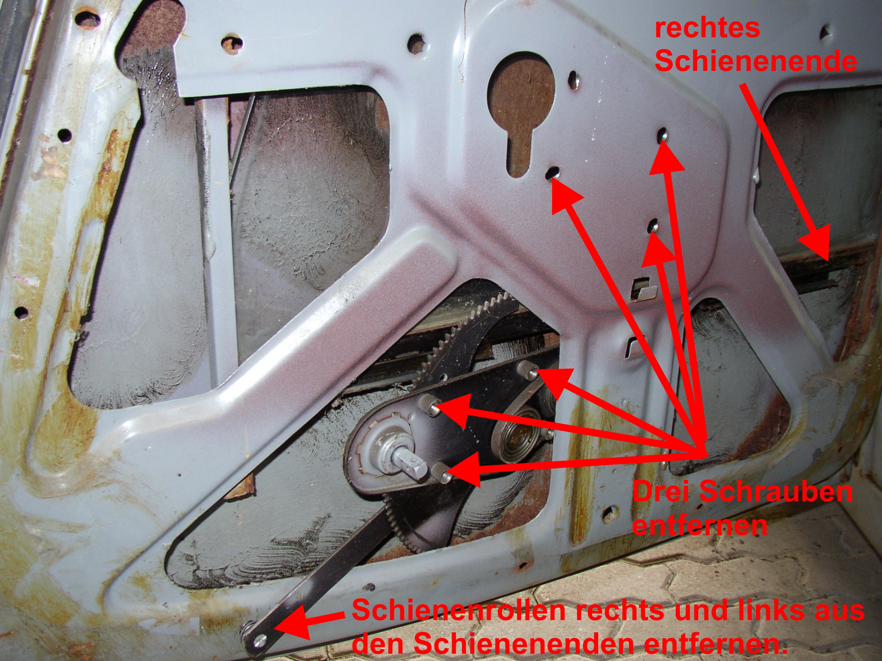 Den schraubt man raus nachdem man die Scheibe rausgenommen hat. Übrigens habe ich einen fehler bei der Beschreibung gemacht. Das fenster musst man mit der mit der unteren halteschiene ausbauen. Einfach seitlich aus der Türe kippen und mit dem Heber ganz nach oben drehen. Dann aus den Rollen ziehen. Ist etwas fummelig, geht aber ohne probleme. Ich würde einfach anfangen, der rest ergibt sich von selbst.