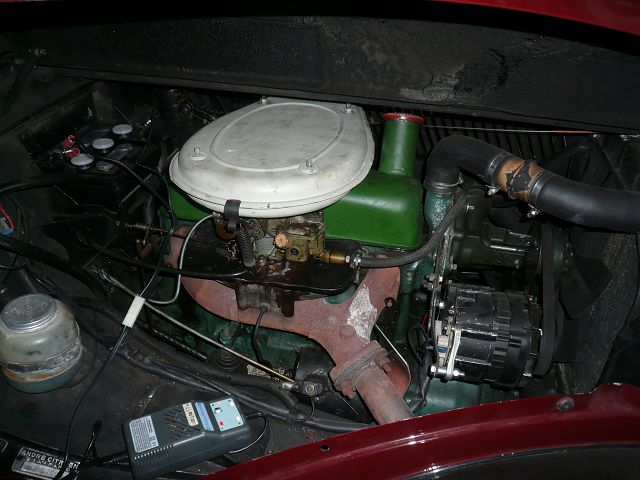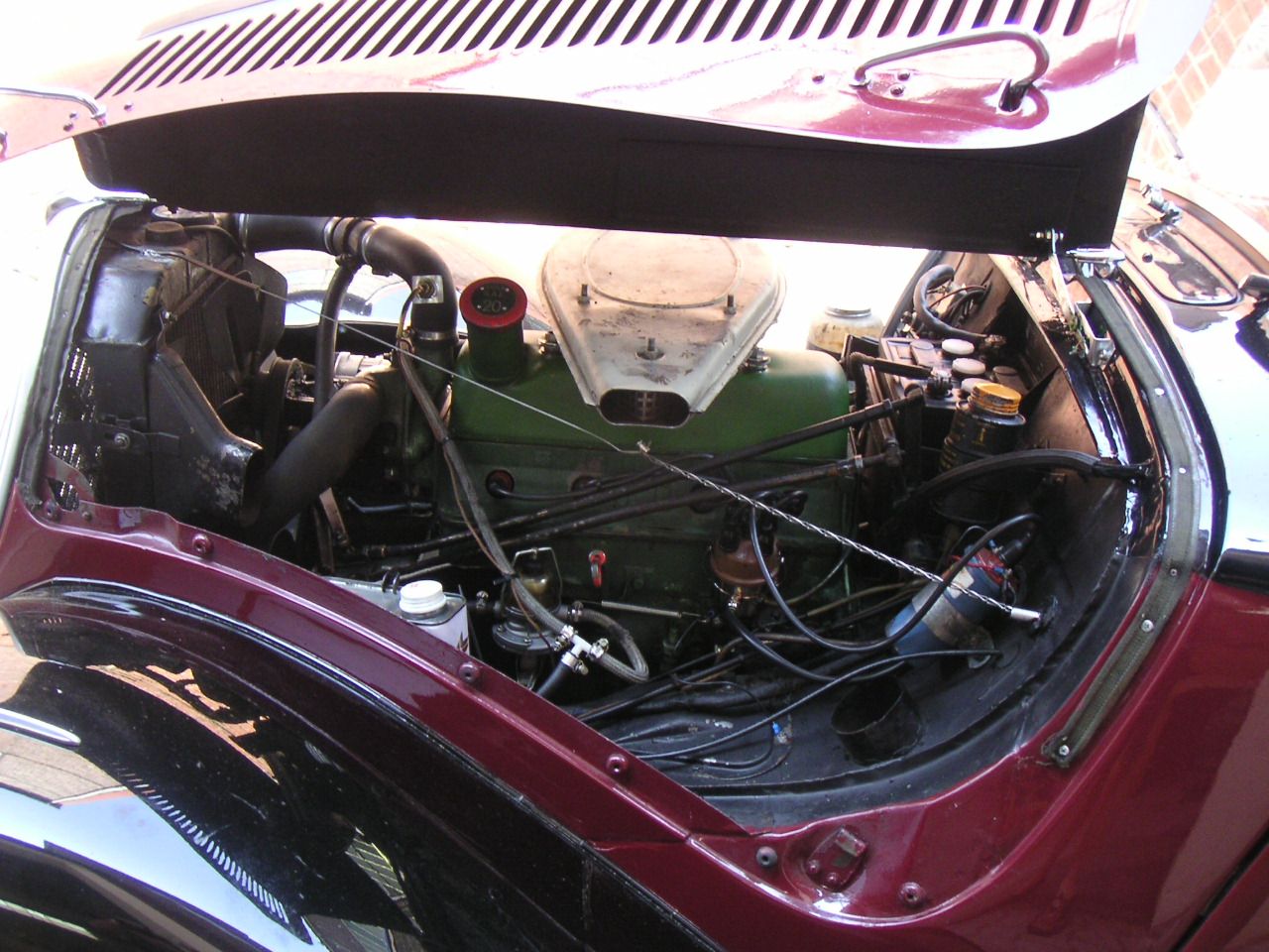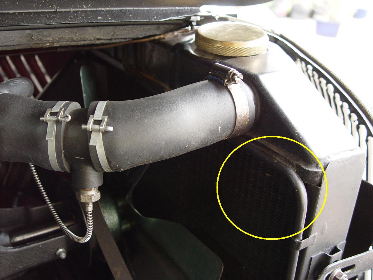 Der Überlauf des Kühlers ist links unter dem verlöteten Deckel, eine Leitung führt von dort längs der Kühleroberkante nach rechts und dort nach unten. Im Bild jeweils gellb gekennzeichnet.