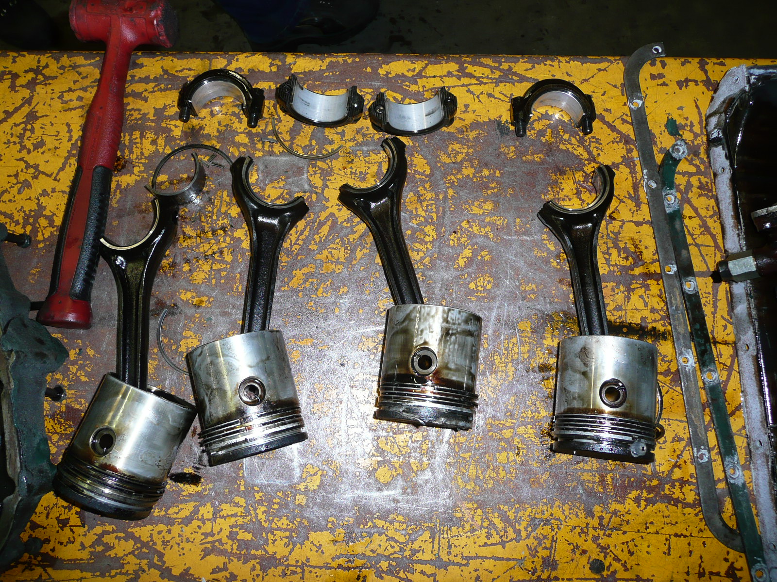 Motor ist nun seziert. An allen 4 Kolben war der oberste Ring gebrochen. Grund: extremer Verschleiß in den Ringnuten. Die Nuten waren bis zu 1 mm ausgeschlagen, daraufhin brach dann wegen der fehlenden Führung der Ring, der dann allmählich immer mehr zerbröselte.