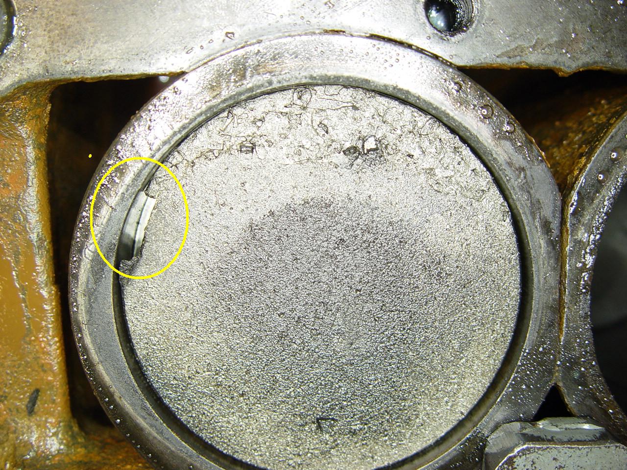 Der Grund, dass die Ringe brachen, ist klar: extreme Aufweitung der Ringnuten. Das Foto der Kolbenhinterseite zeigt deutlich, dass der Ring dort fast 1 mm Spiel hat, auf der nun zerstörten Druckseite somit jedenfalls mehr.