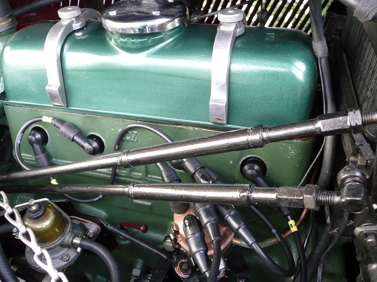 ... und die beiden Schaltstangen, die teilweise nur 15 mm über den Verteilersteckern laufen, mit dickem Kunststoffschlauch isoliert (und abschließend lackiert).