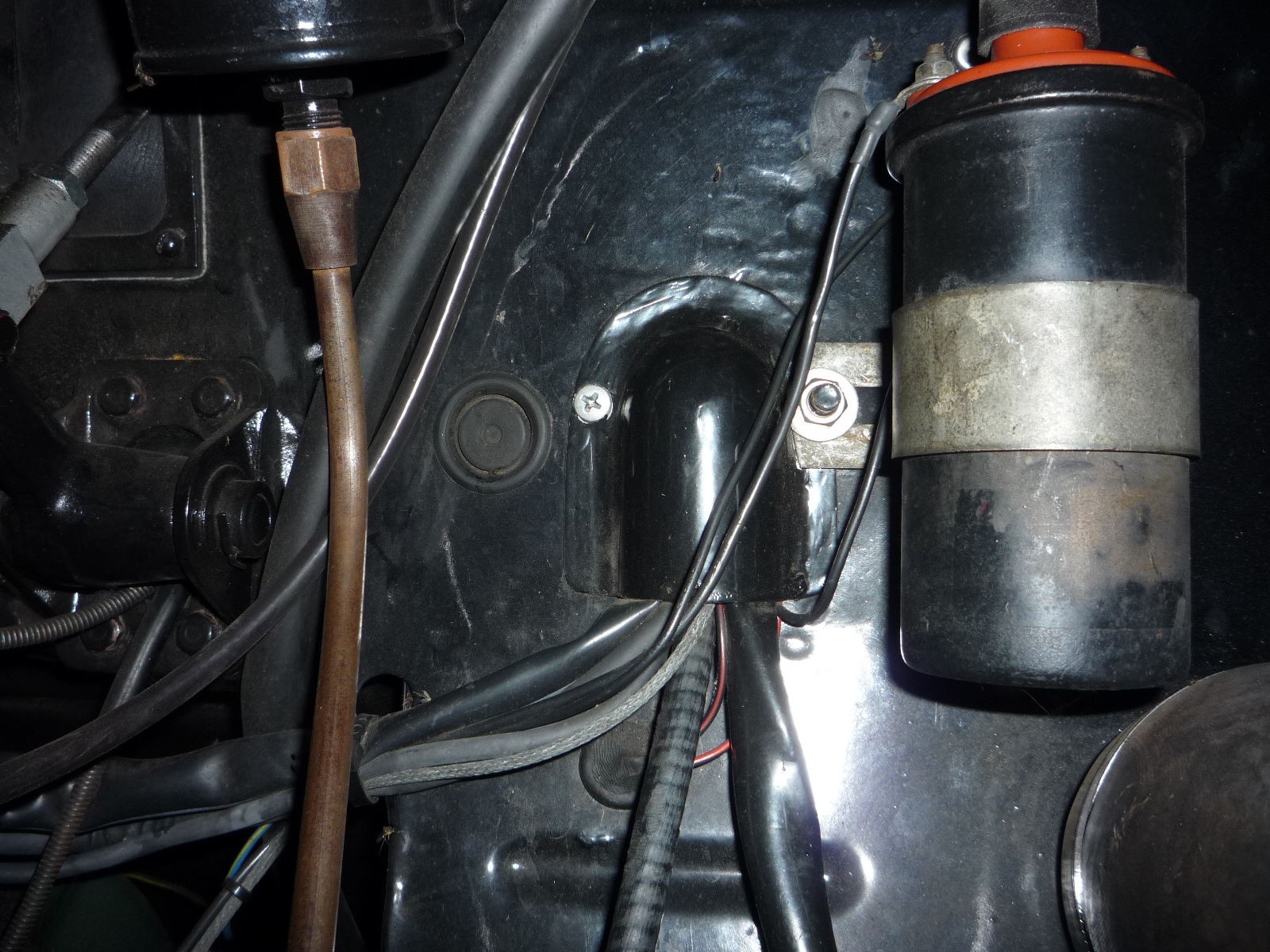 Ja, das stimmt. Trotz wegen der dünneren Isolierung schlankeren Einzelkabel ist der Strang letztendlich dennoch dicker geworden. Öldruckschlauch, Temperaturanzeige, und einige Zusatzfunktionen fordern ihren Tribut. Zudem habe ich - 6-Volt-gerecht - große Querschnitte verwendet, 6², 4² und 2,5² mm und mich im Zweifelsfalle zur dicken Seite hin entschieden. Da oberhalb der Durchführung nun ein Sicherungskasten sitzt, werde ich den Deckel in Anlehnung am Original nun selbst dengeln; die Außenmaße bleiben, nur der Strangkanal wird größer.