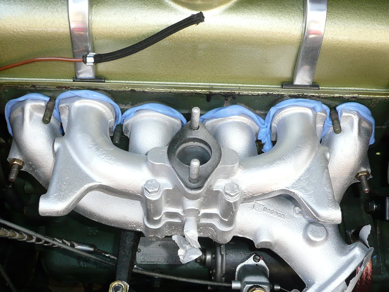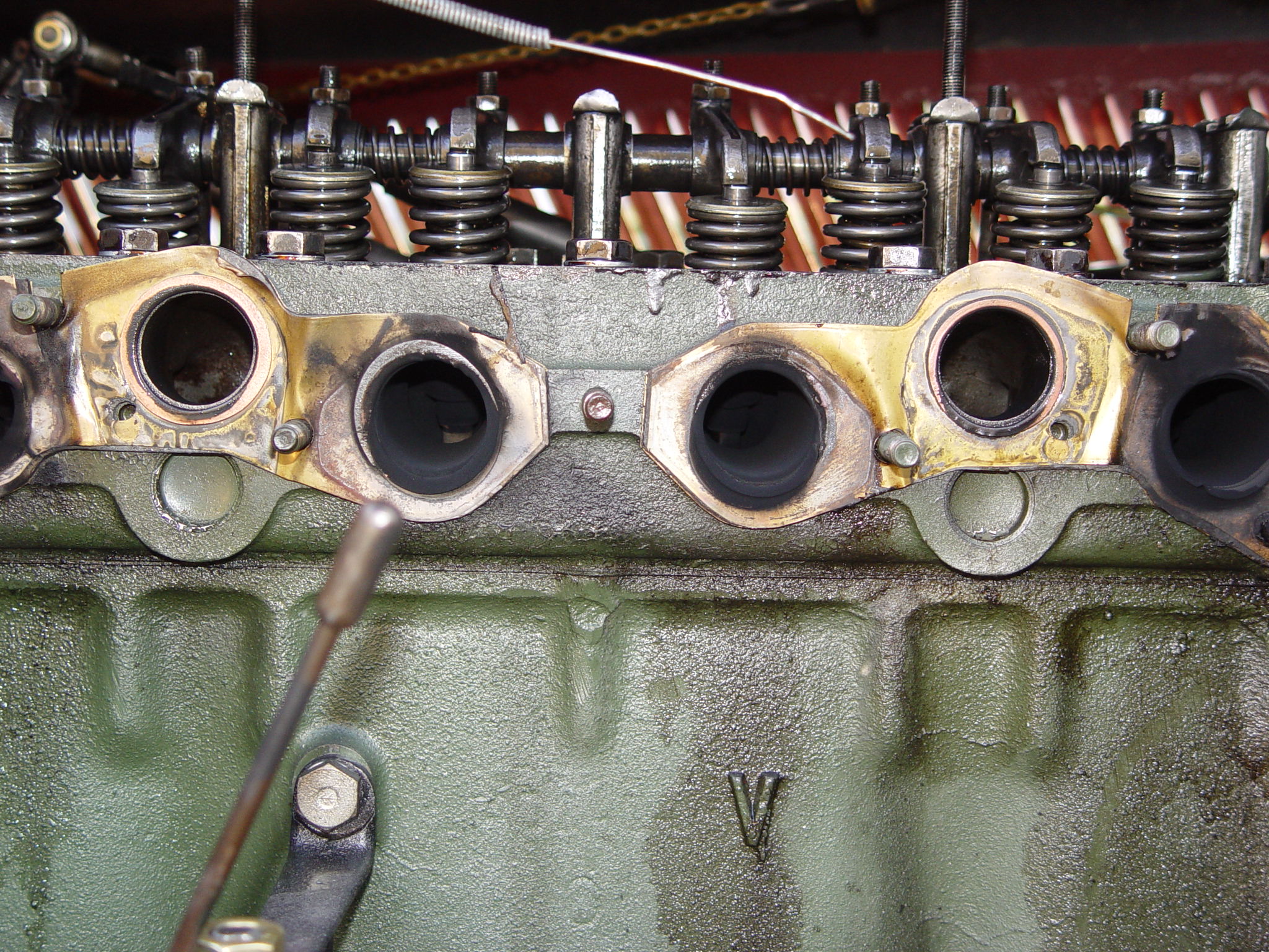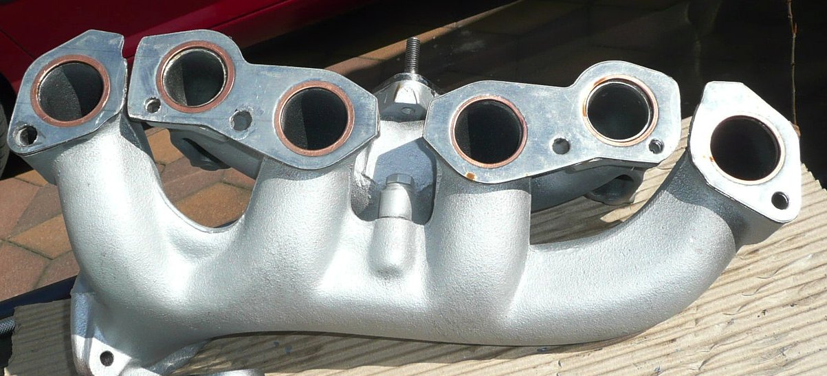 So, der Krümmer ist wieder drauf. Als wohlgemerktes Provisorium. Die beiden 3-er Dichtungen habe ich getrennt, um die Passungenauigkeit wenigstens bezüglich der Krümmerbohrungszentrierung auszugleichen. Gut zu sehen ist, dass die Bohrungen der Dichtungen erheblich zu groß sind; Soll 30 mm, Ist fast 33 mm. Wenn ich einen ordentlichen Originalkrümmer ergattert habe, dann passe ich den mit 6 einzelnen gefertigten Dichtungen aus einer 3 oder 4 mm dicken Kupferplatte an. Viel Anpassungsarbeit, die sich jedoch lohnen wird. - Zum eigentlichen Thema zurück. Nun habe ich auch die Kabel und die Stecker getauscht - der 2. Zylinder hinkt nach wie vor. Habe alle (offenbar eben nicht!) Fehlermöglichkeiten durch - jetzt bin ich echt ratlos!
