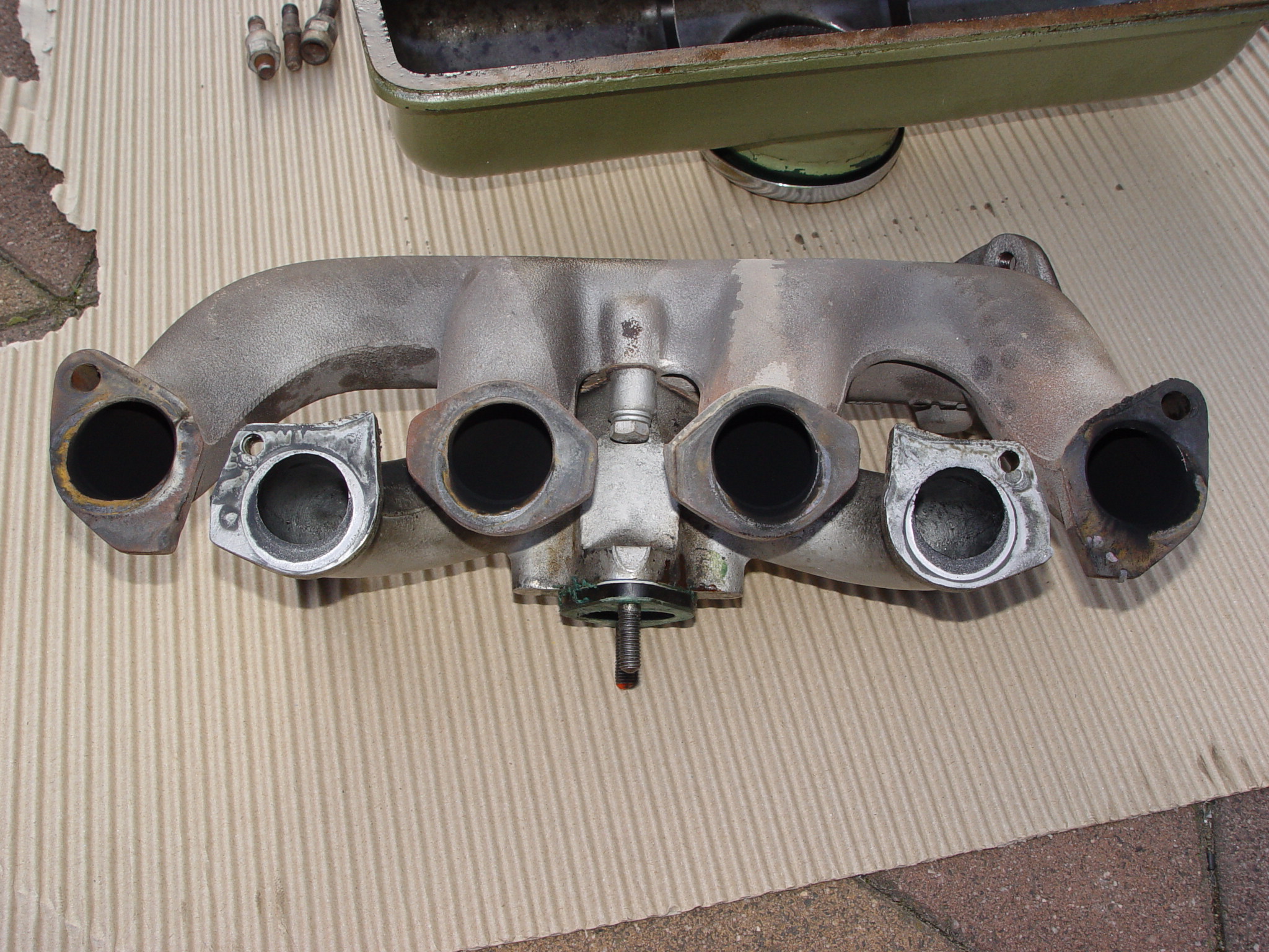 ... Sehr gut sind auch die unterschiedlichen Rußantragungen am Krümmer zu erkennen. So etwas kostet natürlich reichlich Leistung, ich denke mal >10 % sind realistisch. Betrifft aber nicht mein Problem des 2 Zylinders. Die Füllung war natürlich bei allen Zylindern von Anfang an beeinträchtigt. Erklärt aber nicht, warum mittendrin die Leistung auf einem Pott absank. Ich werde morgen mal mit Zahnabdruckmasse den Krümmer montieren und dann sehen, ob sich Kopf und Krümmer nicht per Frässpindel in Flucht bringen lassen. Allerdings muß ich dann auch die Dichtungen angepasst selbst anfertigen ...