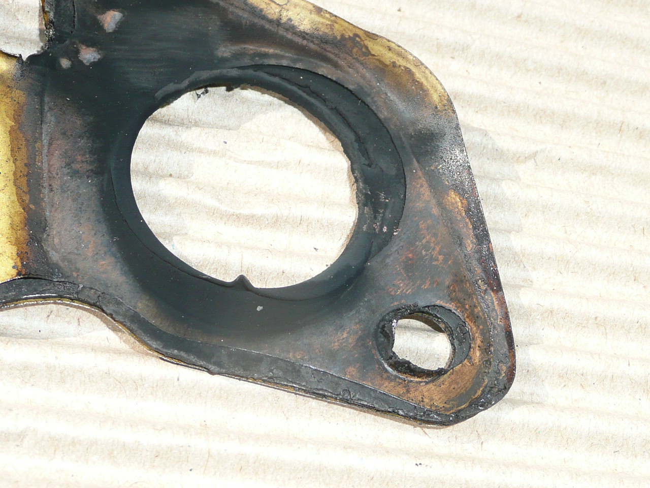 ___Aber auch alte kollektoren muss man bei einer motorrevision auf die übergangspassung kontrollieren. Denn der natürliche verzug ist manchmal auch nicht zu verachten. >>>Ja, das stimmt zwar, aber dieser "natürliche" Verzug lässt sich einfach planen und beträgt in meinem Fall in der Höhendifferenz etwa 0,5 mm. Der Nachbau - mit "CTA"-Prägung - ist schlichtweg von der Gußform her krumm. 3 mm Abweichung in der Bohrungsflucht können nie auf Verzug beruhen. Das ist Pfusch in Serie. Somit können auch die 3-er Dichtungen nie passen. Ich werde daher aus 3 mm Kupfer einzelne Dichtungen sägen und mit Sekundenkleber exakt an den jeweiligen Kopfauslässen ausrichten. Dann stimmt zwar nach der Montage die Flucht zu den Krümmeröffnungen immer noch nicht, aber wenigstens sind dann die Gaskanäleübergänge nicht doppelt behindert. Das Bild zeigt, wie schräg der Nachfertigungsmist tatsächlich sitzt.