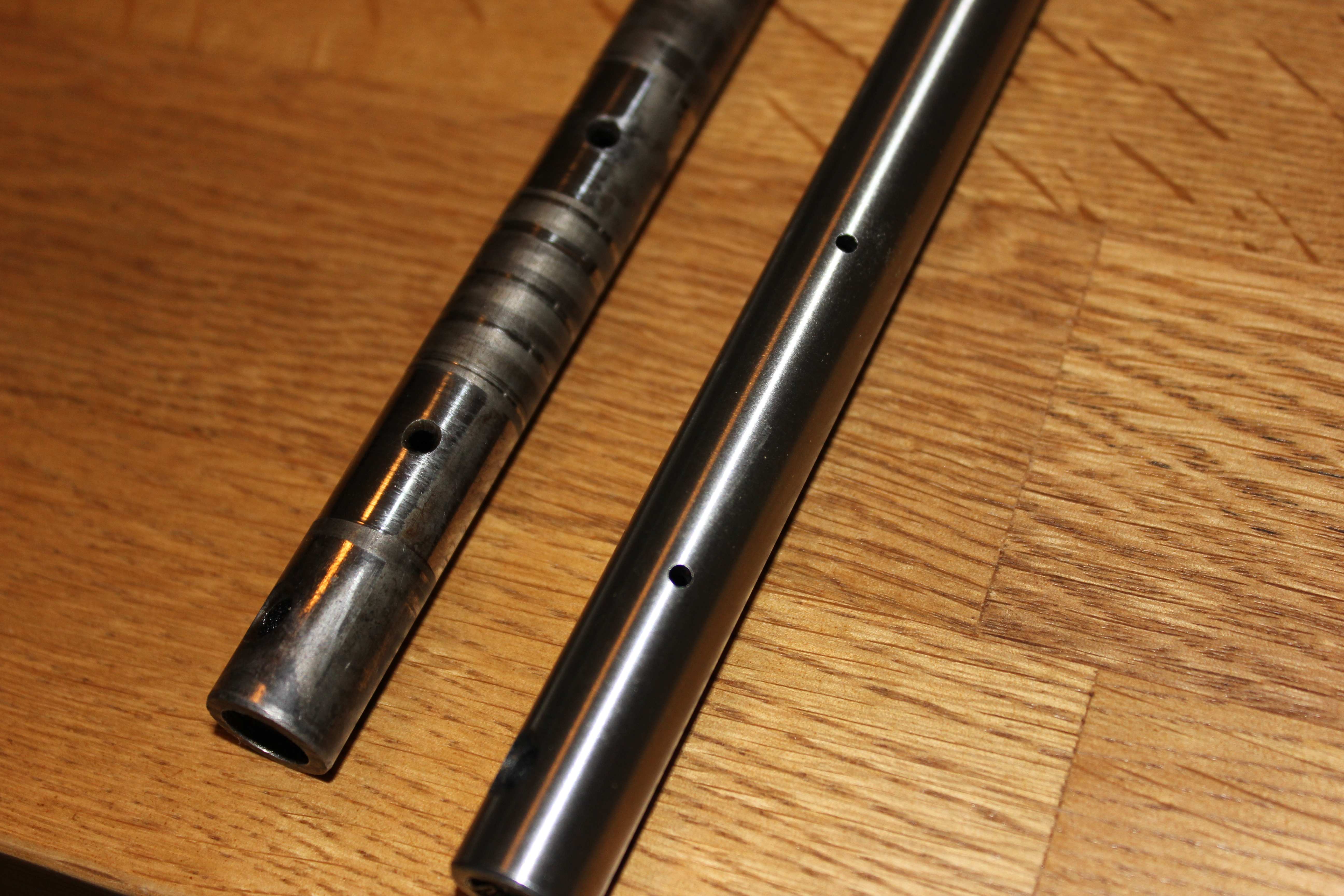Möchte dem Bild 335 von Werner meine Kipphebelwellen ergänzen. Links die alte, eingelaufen, krumm, rechts eine neue (Firma Arrow?). Die alte Welle war auch nicht aus Pappe, also relativ hartes Material, dass sich mit einer Feile nicht ohne weiteres bearbeiten lässt, trotzdem Wellenform. Die neue Welle macht abgesehen von den nicht entgrateten Ölböhrungen einen guten Eindruck, sie ist zumindest auf 1/100 mm maßhaltig. Über das Material kann ich noch nichts sagen. Die Ölböhrungen der KH sind bei der neuen Welle leicht versetzt, aber nicht zum schlechten, weil in Richtung unbelasteter Fläche. Bei der alten Welle zeigen sie 45° nach unten.