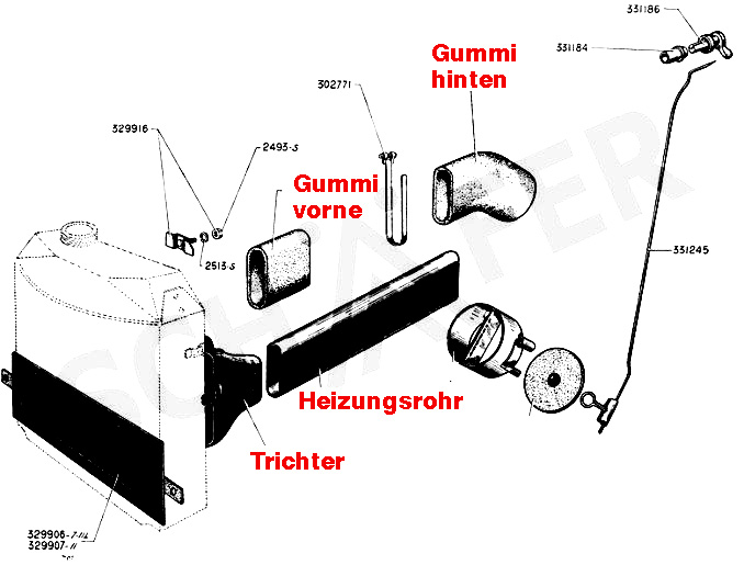 ...ein 36er hatte eigentlich noch keine "Heizung" ab Werk, diese kam erst ab November 1938. Anbei eine Zeichnung der Teile, die ab dieser Zeit "original ab Werk" eingebaut waren. Hilfreich wäre aber auch, mal ein Foto von Deinem "Originalteil" zu sehen.