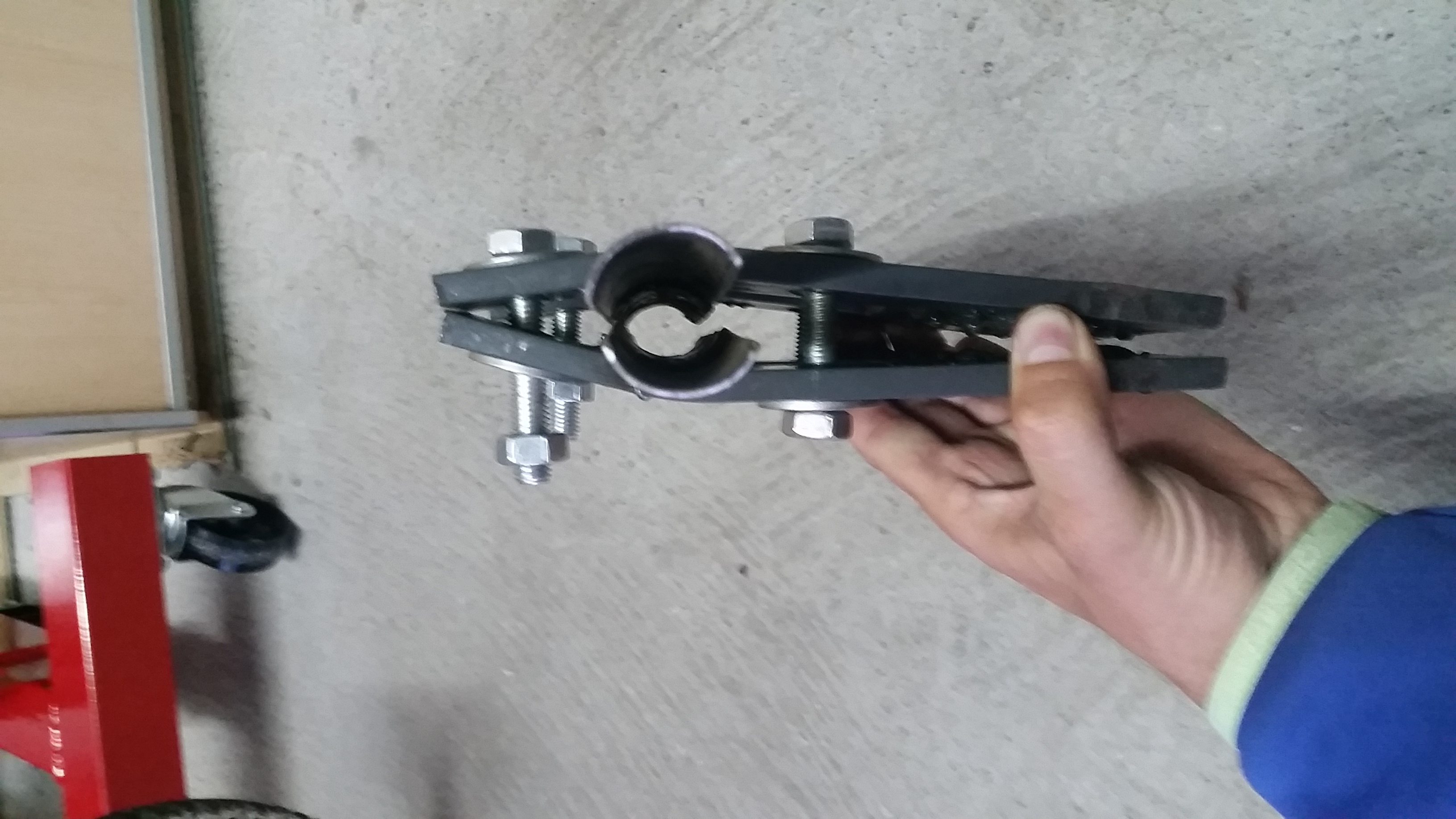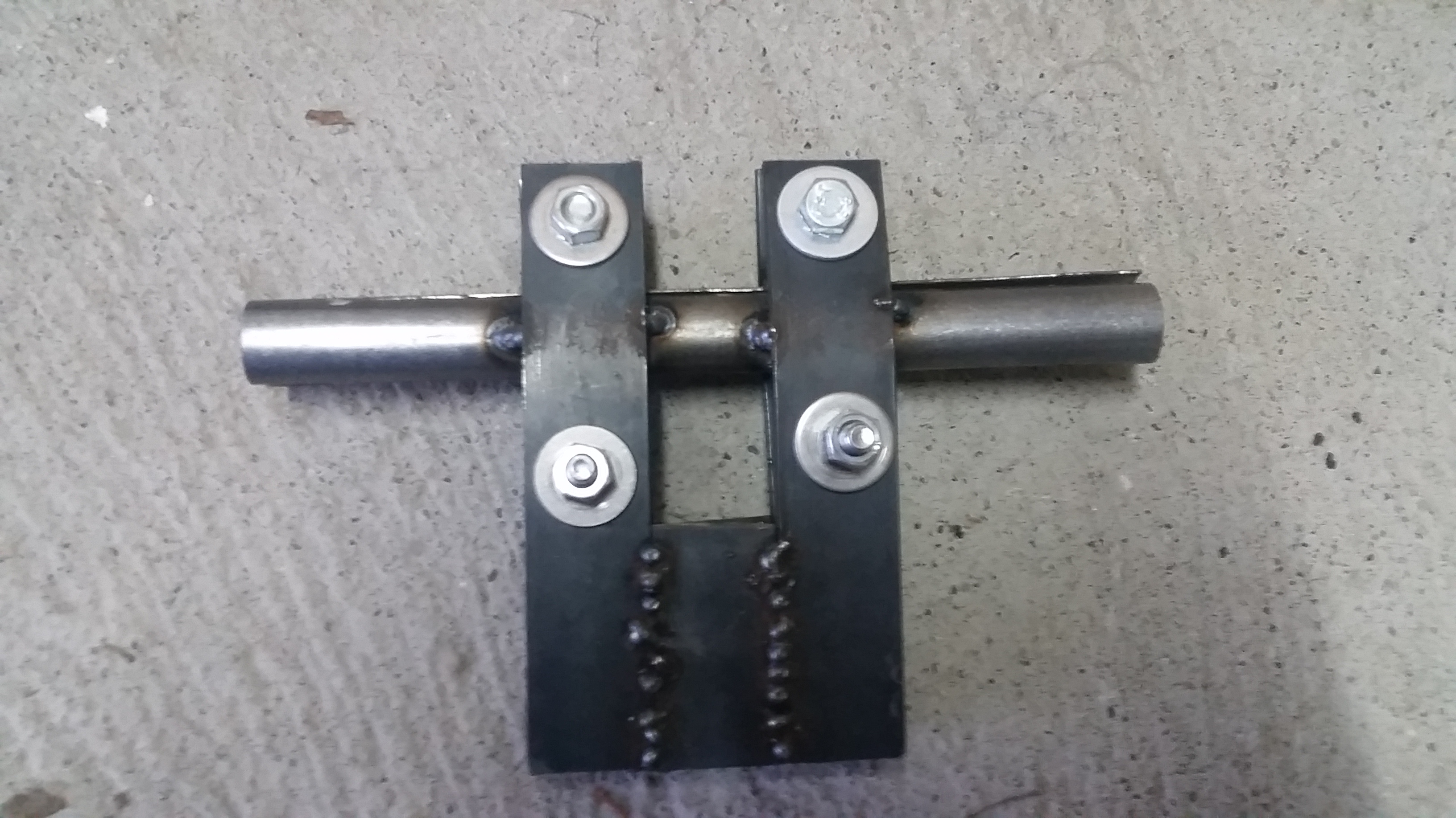 Im Baumarkt 1m Flachstahl (10mm dick, 40mm breit), 1m Stahlrohr (Innendurchmesser etwas kleiner als der Torsionsstab) und 4 x M8 Schrauben mit Muttern und Scheiben gekauft. Den Bandstahl in mehrere Stücke zertrennt, Löcher gebohrt und vorgebogen, das Stahlrohr abgeschnitten und längs mittig mit der Flex aufgetrennt. Das ganze dann wie auf den Fotos zusammen geschweißt. Ich denke das ist selbst erklärend.