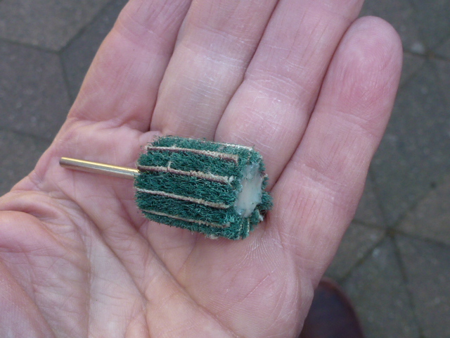Ich reibe nah an das erstrebte Maß auf, den Rest mache ich durch Honen. Früher benutzte ich dafür eine Honstein-Ahle, wie sie auch für Bremszylinder verwendet wird. Inzwischen mache ich das mit zylindrischen Fächerschleifern (s. Bild), was sehr gut gelingt. Die letzten Züge kreuzdiagonal mit grober Ventil-Einschleifpaste und sehr geringer Drehzahl.   -