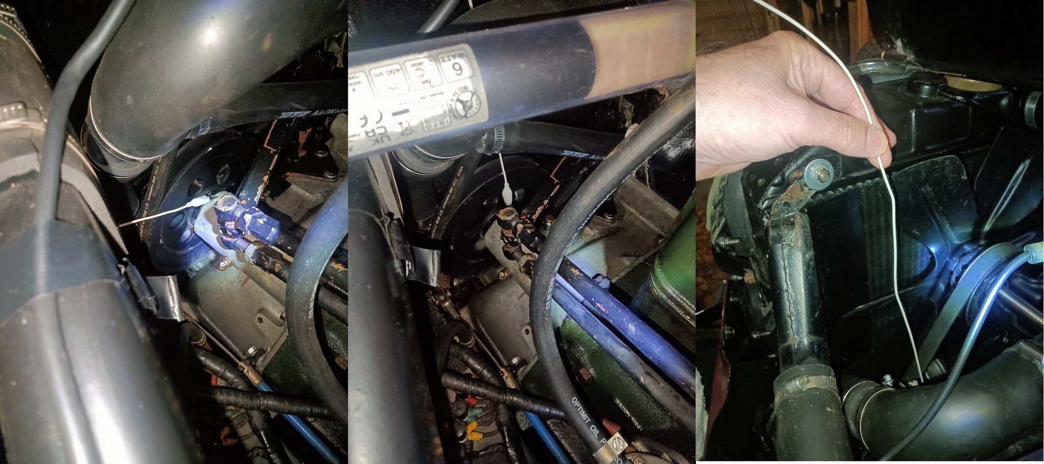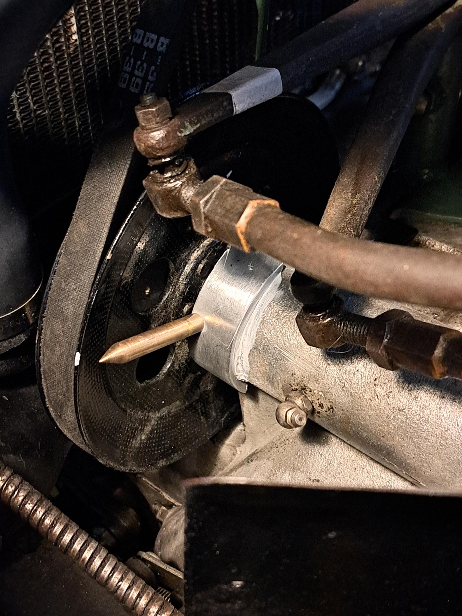 Sowohl die Markierung auf der Riemenscheibe als auch der Stahldraht, als Bezugsmarkierung, sind gut zu sehen.