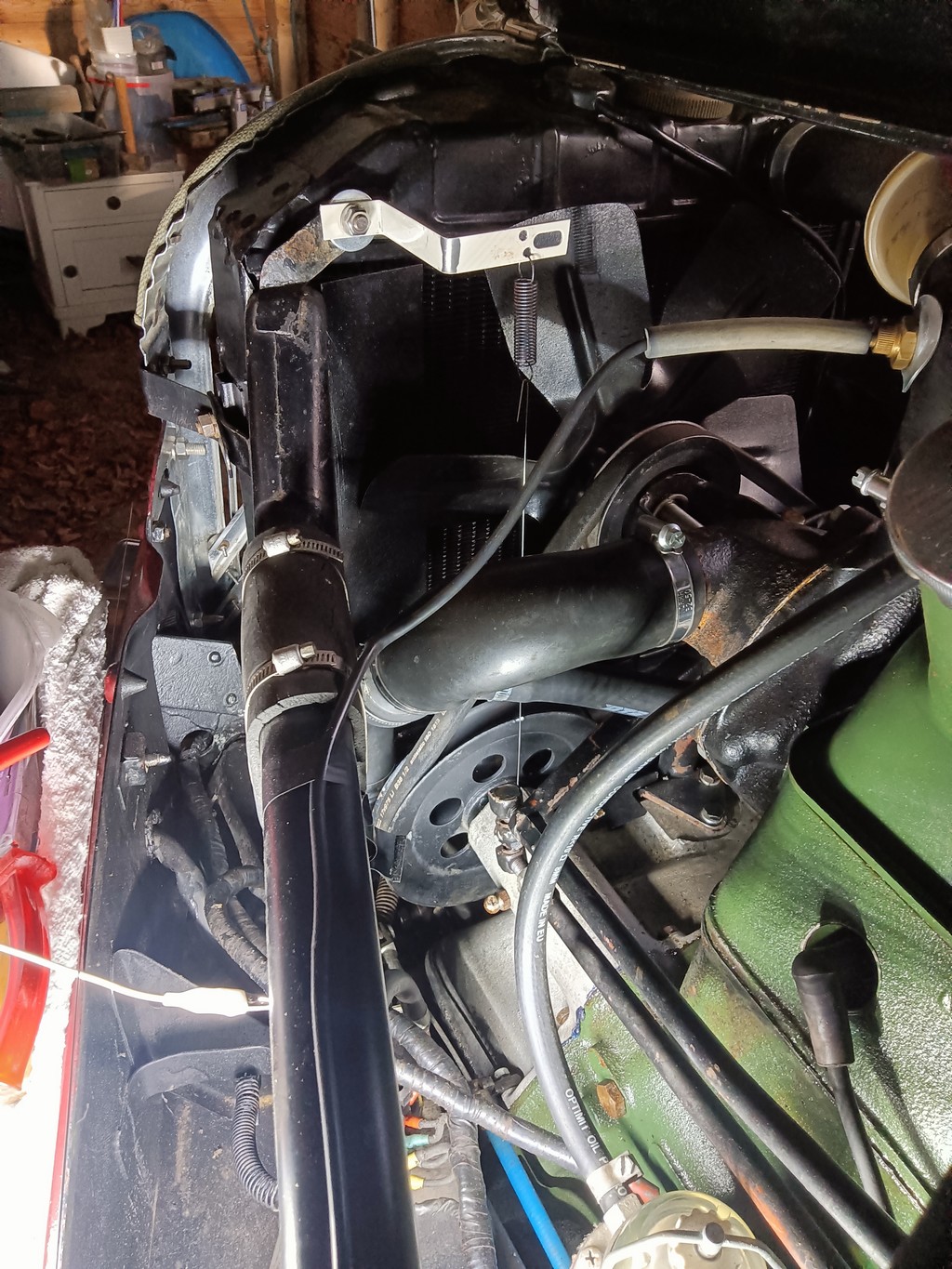 Die andere Seite befestige ich entweder links am Karosserie oder senkrecht nach oben an einem kleinen Aluwinkel der an das Gewinde des Kühlers geschraubt wird.