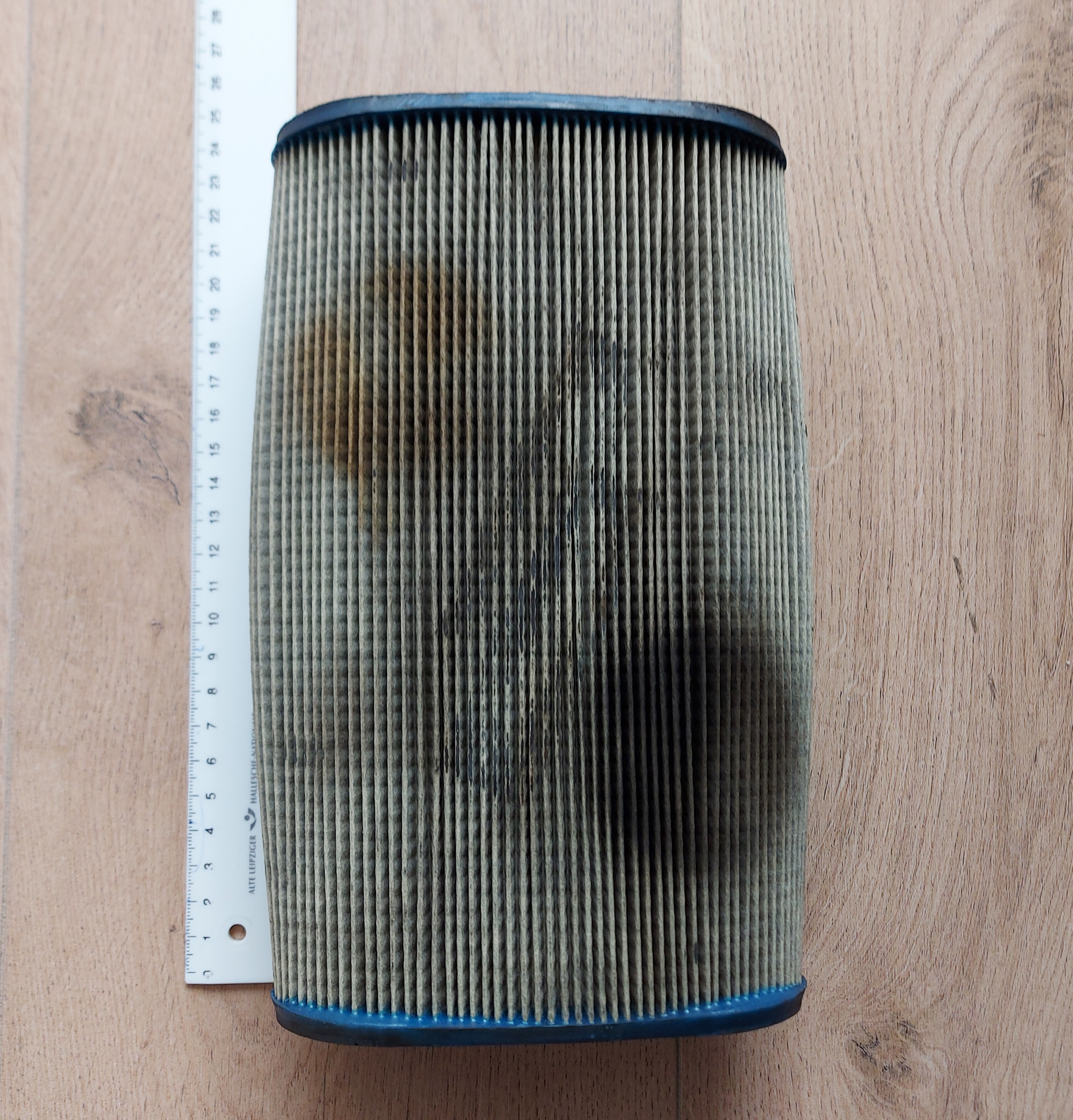 Ich suche den im Foto abgebildeten Luftfiltereinsatz mit 23 Zentimeter Länge (28 cm passen nicht) für meinen Tractioan avant 11 BN, Bj. 1954 für das Vokes-Gehäuse, bei dem der Deckel mit Klammern geschlossen wird.