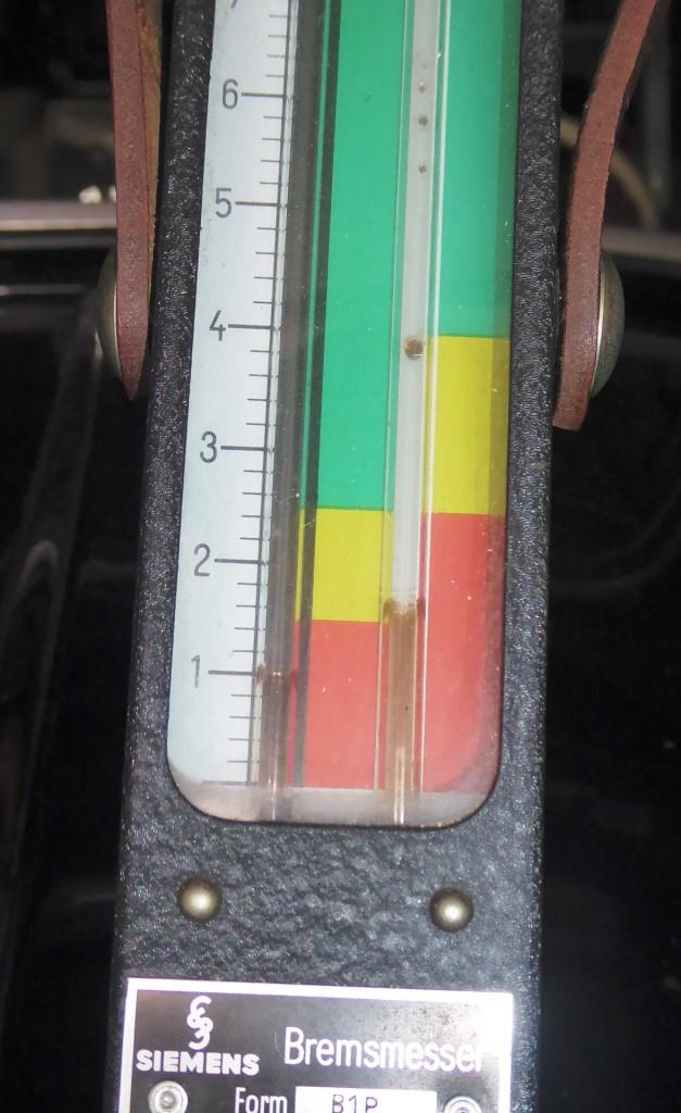 Werner schrieb:Der (plombierte) Bremsentester wird in den Fußraum des Autos gestellt. Beim Bremsen schiebt durch die Trägheit der Masse Quecksilber hochviskoses Öl die Säulen hinauf. Der Verzögerungswert kann dann anhand der gut erkennbaren Verlaufsspur abgelesen werden.